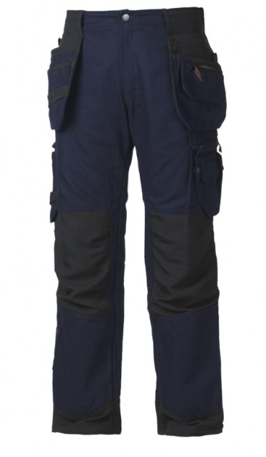Forsterkede hengelommer. Doble hammerholdere. Lårlomme med glidelås, liten lomme nederst på bein, tommestokklomme. Reflexpiping bak på venstre ben. Avtagbart nøkkelbånd i høyre lomme. Forsterket med polyamid på utsatte steder. Knelommer for kneputer art. 972290 og art. 972292. ID-kortlomme.